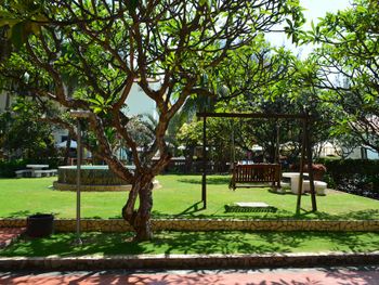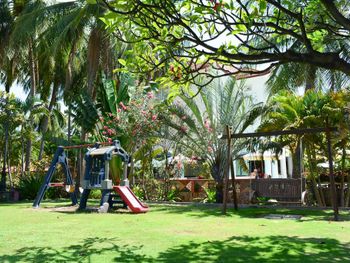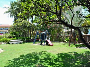 Детская площадка - это качель с горкой, на зеленой площадке)