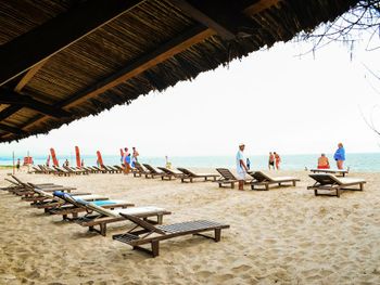 Пляжная зона с лежаками небольшая, в тени не хватает мест. Матрасы на лежаках разорванные тли частично, или пополам.