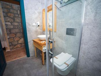 Двери в кабинке плотно не закрываются. Душ требует замены (брызги во все стороны, а верхний душ и вовсе не работает). Крышка унитаза или не открывается, либо не до конца закрывается. Напор в раковине не регулируется – только сильный и соответсвенно брызгает во все стороны.