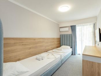 В номере на третьем этаже, под крышей, очень жарко. Кондиционер почти не справлялся и работал 24/7. В двухкомнатном номере один кондиционер, и он расположен в "детской" - в комнате с двумя кроватями.