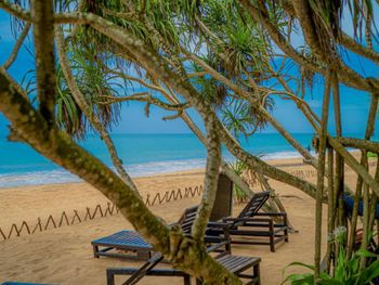 очень интересное местоположение на пляже, тк вместо зонтиком служат деревья, которые как заросли джунглей с вкраплениями цивилизации (шезлонги гамаки и столики ) спасают вас от солнца, делая приятный тенек.