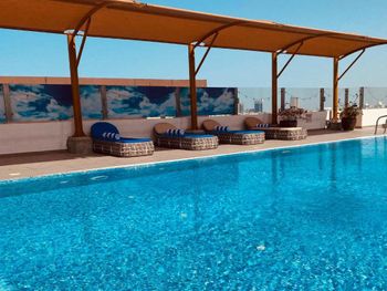 До ближайшего ТЦ идти около 700 м, что по палящему солнцу не каждому понравится. До улицы с ресторанами и обменниками еще немного дальше - около 1 км. Адаптеры для российских розеток не выдают, но если посильнее воткнуть зарядку в местную розетку, то заряжать будет. Деньги в отеле обменять можно, но возьмут комиссию.