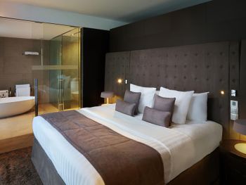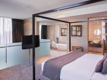 Номера оформлены в современном стиле, в каждом из них есть гостиная зона с телевизором с плоским экраном. В ванной комнате установлены ванна и душ, имеются бесплатные туалетно-косметические принадлежности.