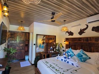Видно что хозяева отеля стараются изо всех сил сделать отдых клиентов комфортным. Сразу после прибытия на остров нас ждали приветственный напиток и подробная экскурсия по острову на электрическом багги. Потом посетили место в лесу где водятся самые крупные кокосовые крабы. Отель окружен большим количеством деревьев, что актуально в жару. Необычный дизайн здания отеля и внутри номеров. В сочетании со световым оформлением и густой растительностью создают вечером свою неповторимую атмосферу. Комнаты отлично декорированы. Номера чистые, ухоженные. Горячая вода, электричество работают без перебоев. В комнате также есть чайник, вода, пакетики чая и кофе. В ресторане кормят вкусно и большими порциями. Заказывать блюда нужно заранее, за час-два. Хозяева очень внимательно изучают ваши пожелания по еде, и стараются угодить в следующий раз. Отдыхом остались довольны !