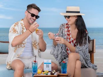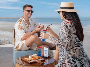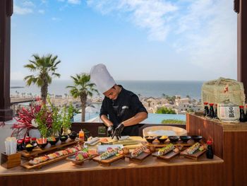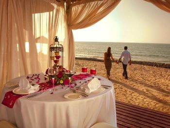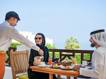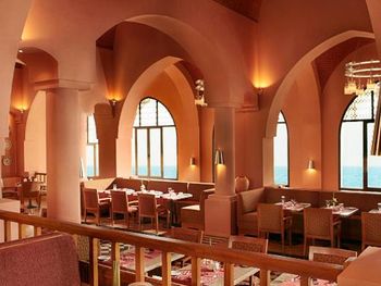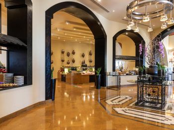 В ресторанах курортного отеля Cove Rotana Resort - Ras Al Khaimah сервируют «шведский стол», в меню которого входят блюда интернациональной кухни, а также восточные и средиземноморские деликатесы. На пляже и в баре у бассейна подают напитки и легкие закуски.