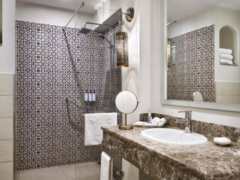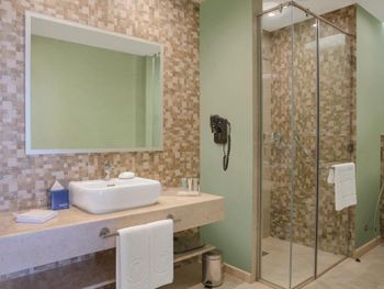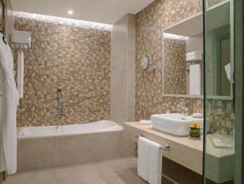 Однозначно не 5 звезд! В номере все старое, сделан средненький косметический ремонт. Кровать большая, но матрас пролежанный, кондиционер гудит как турбина самолета, ванная комната - ужас: стеклянная перегородка еле держится, старая сантехника, фен из прошлого века с пожелтевшей пластмассой, которым страшно пользоваться…