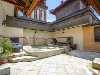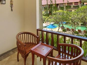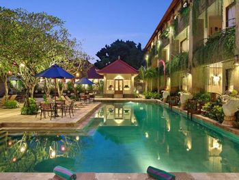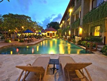 Отель очень, очень старый. Просто древний. В номере три розетки - под окном, совершенно не функциональные. Горячей воды в душе последние несколько дней не было, слив в душевой кабине и туалете работал плохо. Выключатель общего света - в коридоре, а не как это сейчас делается в современных отелях - у кровати. Просто ужасная кровать, огромная по размеру (две сдвинутых), с большим перепадом между уровнями матрасов. В результате мы спали на одной половине вдвоём. Дорогой ресторан (но в этой части острова всё необоснованно дорого, мы были в шоке от цен в Нуса-Дуа). Старенькие полотенца у бассейна. В отеле малюсенькая территория, по сути внутренний двор с бассейном, парой десятков лежаков и 4 столиками.