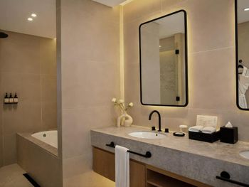 Отличный отель. Вкусный и разнообразный завтрак. Хорошо убирали в номере каждый день и оставляли бутылки с водой. Были все туалетные принадлежности а также чай кофе. В комнате был чайник, кофемашина для капсул, утюг и гладильная доска. До метро минут 7 ходьбы. Позволили выехать на пару часов позже, чем положено. Отличный уютный спа и услуги массажа со скидкой до 2х часов дня. Предоставляется бесплатный трансфер два раза в день на пляж Ла Мер и деревню аутлетов, но мы этим не пользовались. Понравился душ, ванна, туалет. Всё чисто и просторно. Хорошо оборудованный спортзал.