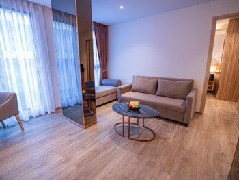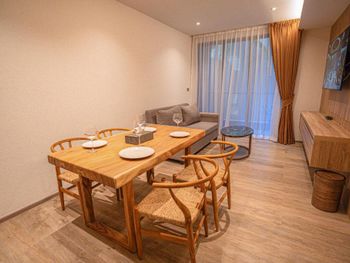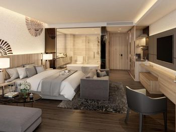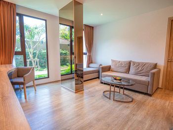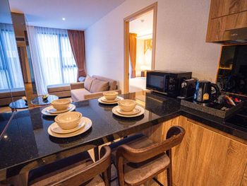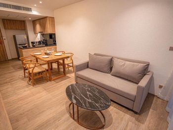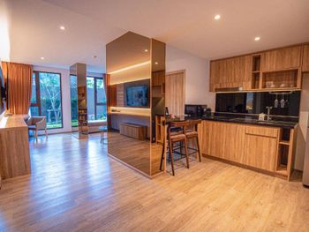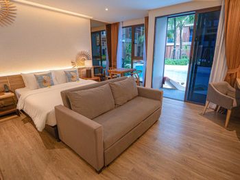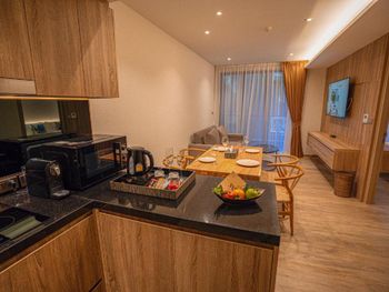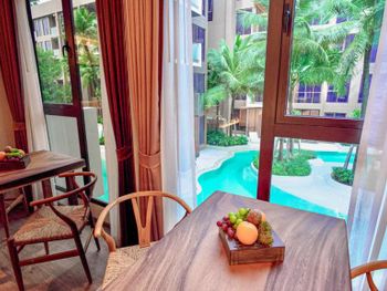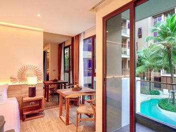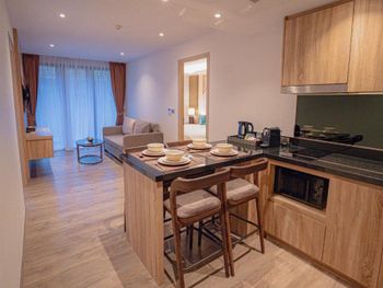 Красивые номера, красивый бассейн на первом этаже, который вечером еще подсвечивается классно. Инстаграмные снимки обеспечены. Вода в бассейне комфортной температуры. До пляжа Камала 5 минут пешком. В номере есть мини кухня, с раковиной, микроволновкой, холодильником, приборами и посудой (тарелки разных размеров, чашки, стаканы, бокалы для 3 видов вина). Еще кофемашина с капсулами. Есть отдельный стол и стулья. Кровать большая. В общем номер укомплектован как мини-студия только без плиты.