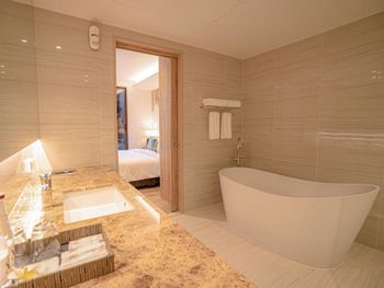 Просторные, с очень большой ванной комнатой: и ванна, и душевая с панорамным видом на спальню — выглядит стильно и романтично. Кровать невероятно удобная, в номере — большой телевизор.