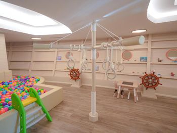 Красивое неоновое освещение вечером. В номере есть микроволновка. Есть игровая для детей (без аниматора)