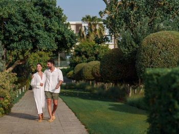 Много птиц на территории, оливковые деревья; очень длинный бассейн с приятной теплой водой (январь), раздавали бесплатное мороженое у бассейна; красивое оформление интерьеров отеля; вкусные завтраки по меню; просторный номер с собственным садом