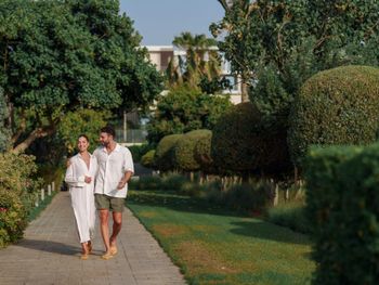 Много птиц на территории, оливковые деревья; очень длинный бассейн с приятной теплой водой (январь), раздавали бесплатное мороженое у бассейна; красивое оформление интерьеров отеля; вкусные завтраки по меню; просторный номер с собственным садом