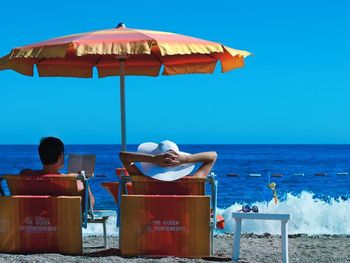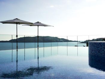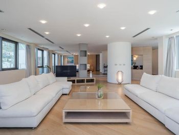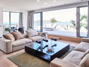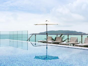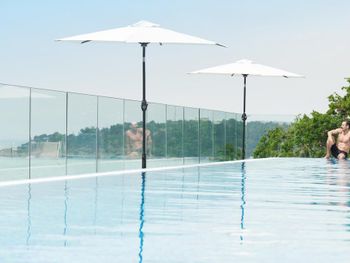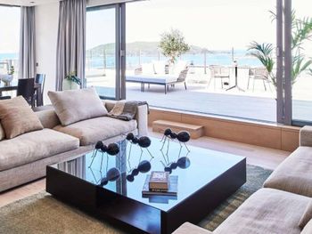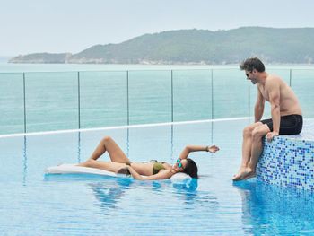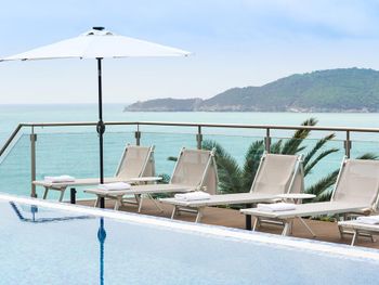 The outdoor swimming pool is situated on a spacious terrace, boasting with stunning sea views.