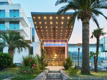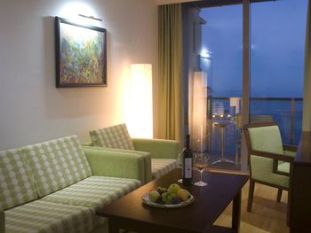 Между отелем и морем идёт шоссе. Все комнаты с видом «на море» (в том числе люкс) в первую очередь с видом на шоссе. Очень (!!!!) шумно, открыть балкон невозможно, выхлопные газы и пр. Кроме того вид на стройку. Вход в море- колючая галька. На дорогу в аэропорт нужно планировать 2 часа (хотя 20 км)- стоячая пробка на однополосной дороге