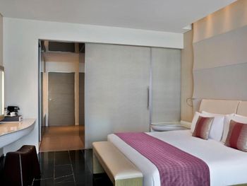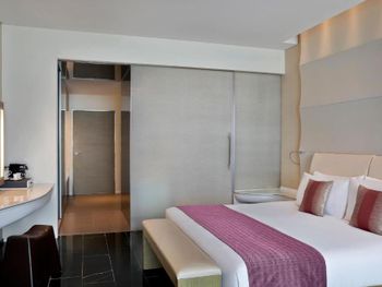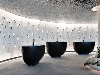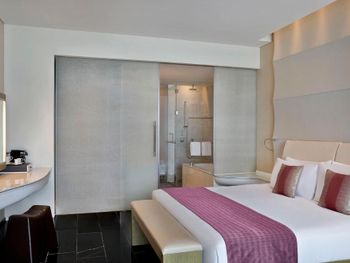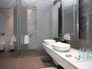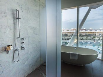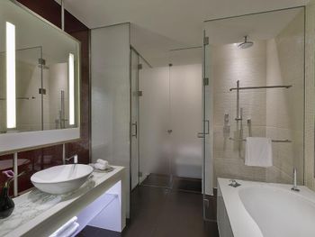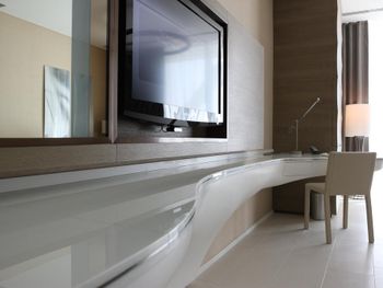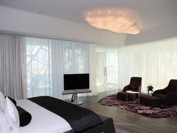 Необычное, современное архитектурное решение. Отель красиво подсвечивается и переливается ночью. Дизайн номера перекликается с основной концепцией здания. Отличный вид на трассу Формулы - 1 на завтраке и при заезде на территорию отеля. Приятный бассейн наверху. Дополнительные подушки и одеяла в шкафу.
