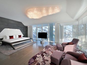 Необычное, современное архитектурное решение. Отель красиво подсвечивается и переливается ночью. Дизайн номера перекликается с основной концепцией здания. Отличный вид на трассу Формулы - 1 на завтраке и при заезде на территорию отеля. Приятный бассейн наверху. Дополнительные подушки и одеяла в шкафу.