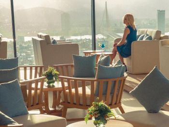 Плавая в открытом бассейне на 25 этаже (с 6 утра до 19 часов), можно наблюдать шикарную панораму на море и город с мостами, лучше чем с Marble mountains.