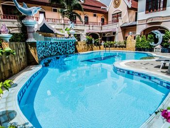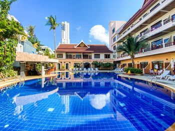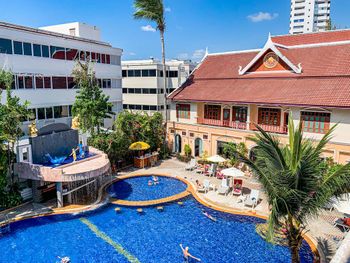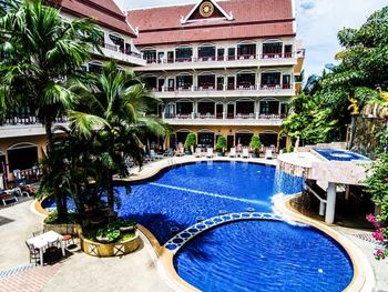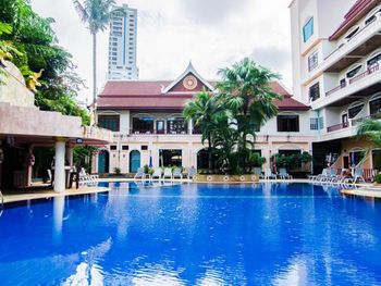 В отеле Tony Resort не работал бассейн, так как он был закрыт на ремонт, поэтому сотрудники отеля нам предложили переехать в родственный отель Amata Resort. Что мы и сделали. Отель Amata Resort находится в пяти минутах ходьбы от Tony Resort и состоит из трёх корпусов. В предложенном нам отеле два бассейна - один на восьмом этаже, второй - внизу между корпусами. И тот и другой бассейн хорош по своему. На восьмом - красивый вид на город, хорошо вечером любоваться закатом, и, к тому же вода там теплее, потому, что он весь день на солнце прогревается. А нижний бассейн частично находится в тени, там вода прохладнее. Бассейны работают с 10:00. Несколько раз заказывали еду в отеле в баре и в кафе, где проходят завтраки. Вполне достойно, цены приемлемые, понравился салат с тунцом. Имеется русское меню: котлеты, борщ, уха, пельмени, картошка (но всё на тайский лад :-).