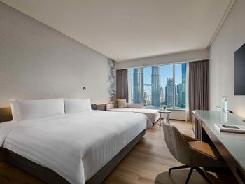 Расположение отличное. Это бизнес отель, который обслуживает гостей выставок и конференций. Рядом располагается Экспо центр. Парк, торговый центр и башни близнецы - напротив. В 10 минутах пешком находится еще один ТЦ для шопоголиков. Хорошая шумоизоляция, быстрое заселение, приятный персонал на регистрации и в зоне консьержа. Помогли с вызовом такси в аэропорт, регистрацией билетов, обменом валюты. Большой ресторан для завтраков, разнообразная кухня всех народов мира. Время работы на завтраке с 6.30, что очень удобно для раннего вылета. Нам разрешили зайти даже раньше. Все уже было готов к приему гостей уже в 6.00. Номер большой, просторный, кровать и матрас очень удобные. Душевая зона укомплектована всем необходимым. Бассейном и другими услугами отеля не пользовались.