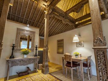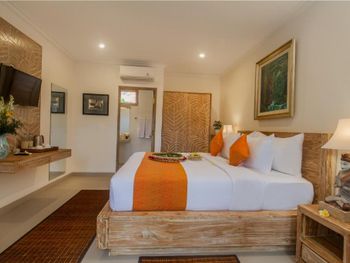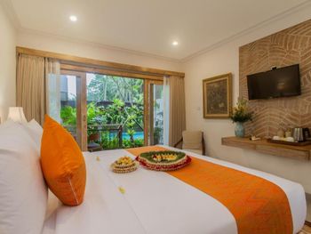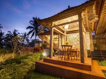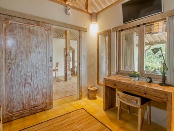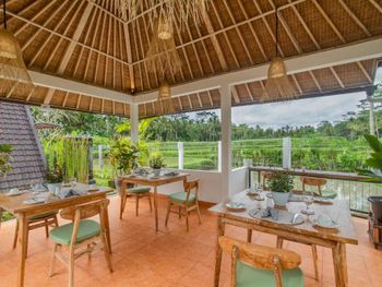 Вполне просторные комнаты вокруг бассейна. В оснащении номера все есть. Прекрасный вид на рисовые поля от места, где завтракаешь.
