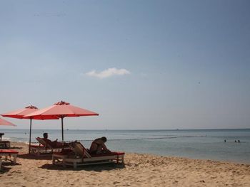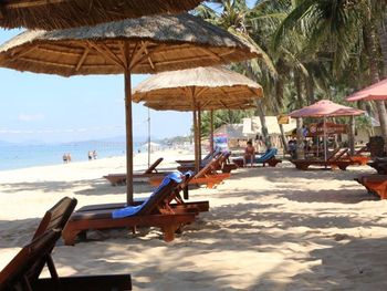 На пляже достаточно много шезлонгов и они очень близко расположены друг к другу, что не даёт возможности расслабиться. При этом отель не ограничивает их посещение только проживающими отеля и на шезлонгах отдыхают все желающие, отель лишь берет с них плату. Поэтому вокруг очень много шумного левого народа, который приносит с собой кучу еды, весь день сидит ест, орет. Чувствуешь себя как на общественном пляже в Крыму.