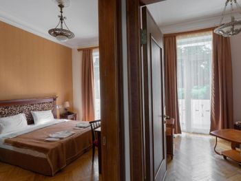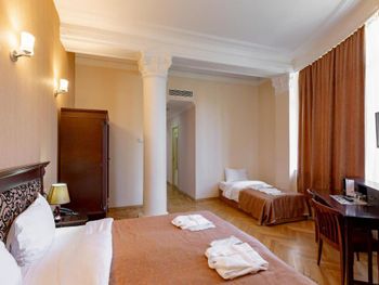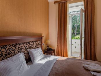 Это СССР. Стоял заброшенный санаторий, кто-то его купил, подкрасил и сказал: теперь это отель 4 звезды. Двери закрываются плохо, если соседи захлопывают, вы просыпаетесь, паркет с выбоинами, лепка на потолке наполовину обвалилась. ее просто подкрасили. Резной камень на балконах или покрыт грибком или покрашен сверху. краска облезает. Обслуживание ленивое. В столовой надо просить, чтобы убрали столики за предыдущими гостями. Ужины - просто бедные и за это просят 40 лари. В любом местном кафе можно поесть дешевле и вкуснее. Массаж должен быть 10 минут - в реале 8, когда платишь за 20 минут, в реале 16. В итоге отказались от всех процедур, которые предлагал отель и у себя и на источнике 6 и убежали во 2 источник, Ворота центральные закрываются в 19:30, если идешь из кафе, нужно далеко обходить через шлагбаум. Белье постельное постелили один раз все в катышках, спать было невозможно, пришлось просить перестелить. Когда делают уборку номера, чашки и бокалы не моют, грязную посуду не уносят. Дверцы шкафа не закрывались, ну просто не закрывались. Брали номер с кондиционером. оказался с неработающим кондиционером. Поменяли, но пришлось повоевать. То есть как бы можно жить, не противно, но вот совок. Ну и обман насчет 4 звезд. Никто бы их никогда не сертифицировал и на 3 звезды.