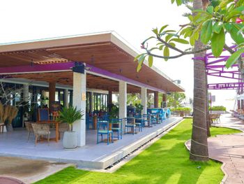 Зеленая территория, чистый пляж и море.