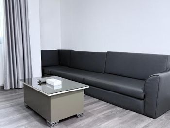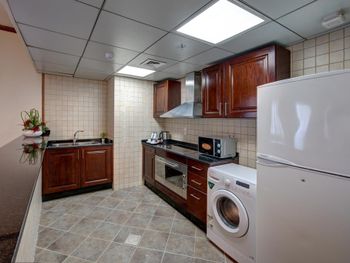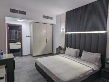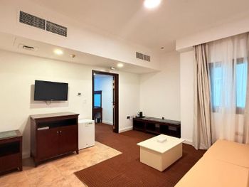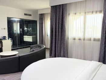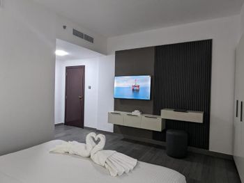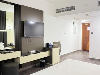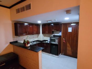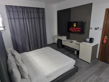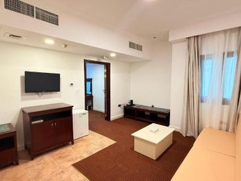 Отдыхали в отеле "Tulip Inn" в Шардже в период с 5 марта по 15 марта 2019 года. Отель заявлен как 3-звездочный, бесплатно бронировали двухместный номер-студио с большой кроватью и завтраками на booking. Оснащение номера апарт-отеля: мини-кухня с микроволновой печью с небольшой мощностью, мини-холодильник, раковина, кухонный гарнитур, чайник, столовые принадлежности на двоих (тарелки, стаканы, приборы, нож) и рабочая поверхность. Заявленная большая кровать в номере, по факту, оказалась двумя соединенными кроватями. Также в номере был телевизор (есть один канал для русских) с пультом управления, кондиционер, вместительный шкаф.