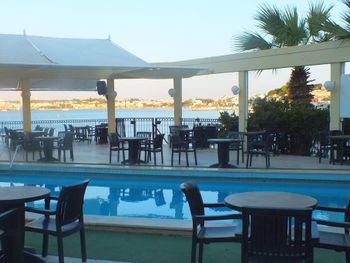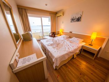 Бронировали номер с фронтальным видом на море над бассейном в итоге дали боковой номер над зоной приёма гостей. Цену при этом не изменили. Но люди говорят номера над бассейном просто крохотные( Анимация с 10.00 до 23.00, музыка даже на пляже рядом играет очень громко - отдохнуть или поспать просто не получится(( пляж маленький, чтобы занять место необходимо класть полотенца чуть ли не в 06.00 утра. Смутила часть пляжа вынесенная на парковку при отеле. Шезлонги стоят на брусчатке. Думаю это ненормально((( дно пляжа песок и камни, грязноват, что сам песок, что море, море мелкое, плавать только можно практически у буяков( Обратили внимание недостаточная чистота столов и общая обшарпанность номеров ((