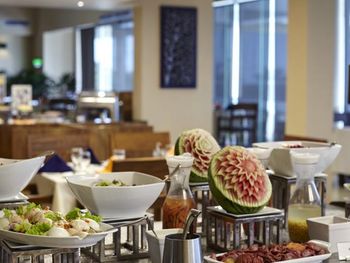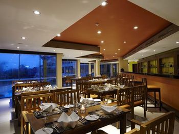 Маленький выбор блюд в ресторане, интерьер немного изношен.
