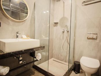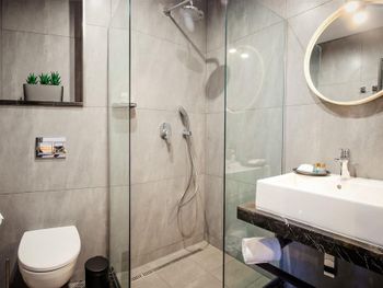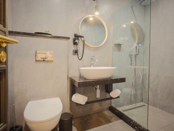 Мелкие недочеты, которые были допущены в проектировании номеров, но не влияют на общее впечатление: из душа брызгает вода на пол, так как душевая кабинка открытая, сама ванная комнате не обогревается и там довольно прохладно.