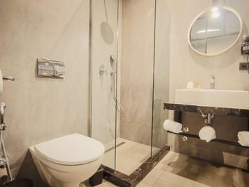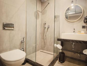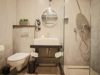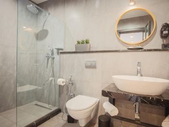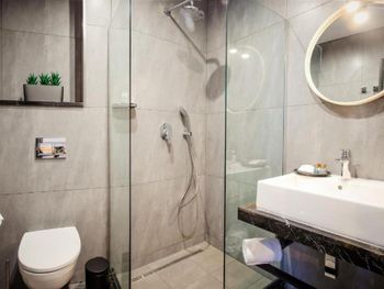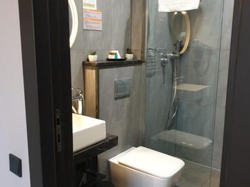 Ванная комната за стеклом, оно слишком прозрачное, не очень удобно это, из комнаты все видно. Душевая кабина не закрыта полностью, поэтому, когда принимаешь душь много воды на полу, приходиться вытерать.