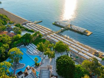Курортный отель с частным песчаным пляжем и пирсом, окруженный зеленым садом, расположен на побережье Кемера. К услугам гостей открытые бассейны и фитнес-центр.