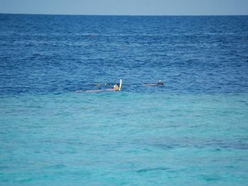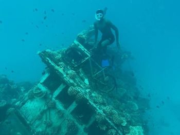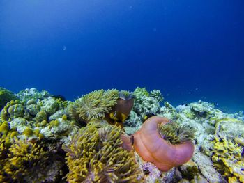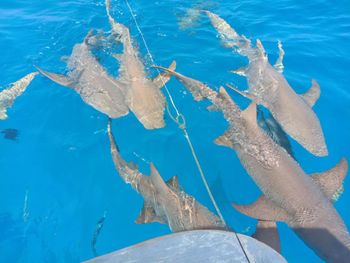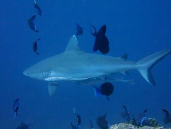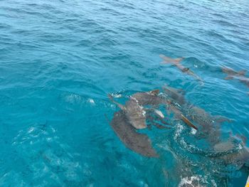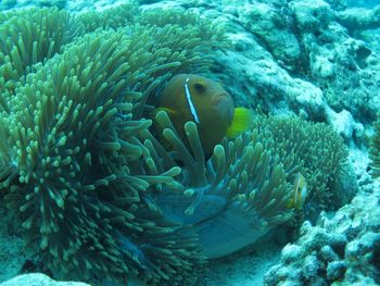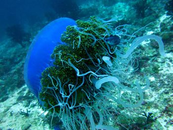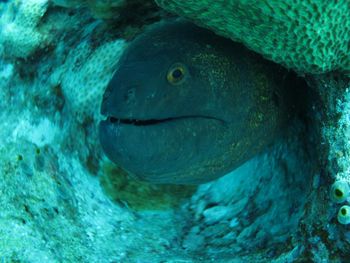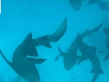 В море есть множество рыб, скаты, мурены, черепахи, акулы.