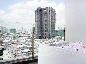 В нашем смежном люксе из мастерспальни был вид на соседний дом. Неожиданно. Более экономичные номера имели вид на Бангкок.