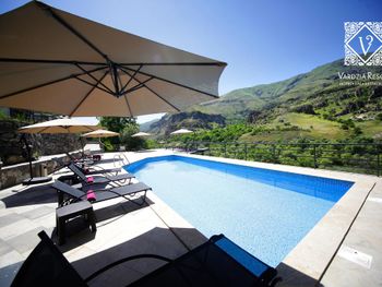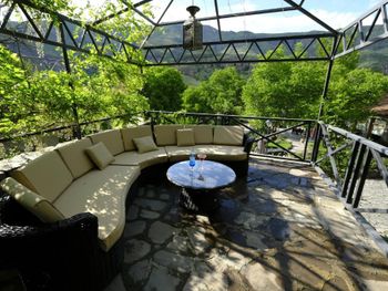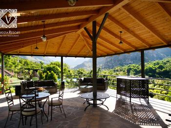 Красивая и ухоженная территория гостиницы с террасами, много зелени, фруктовый сад, бассейн свидом на реку и горы, зелёная лужайке с качелями в тени деревьев. Дружелюбный и внимательный персонал. Хороший ресторан на территории гостиницы. Просторный и чистый номер с выходом прямо на террасу, два бассейна.
