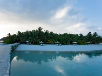 Жили на вилле №147 - вид на закат при хорошей погоде - фантастика! С этой стороны острова пляжная полоса широкая и удобная, но сноркать мы уходили на пирс, идущий от рецепции (у вилл со 101 по 110 пляж узковат, но зато до рифа - подать рукой). К вилле "привязаны" 2 лежака и зонт - к нашему выходу на пляж лежаки всегда были уже застелены :-) Морская живность - разнообразнейшая! коралловый риф же почти погибший - живых кораллов мало, но это, увы, почти повсеместно на Мальдивах после 2015г. Маски и ласты брали в центре водного спорта - без залога паспорта и бесплатно.