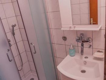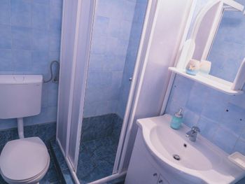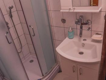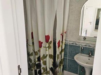 Маленькая туалетная комната. Душевая со шторкой. Шторка мешала принимать душ. К сожалению не сделаны фото.