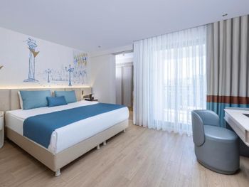 Замечательный пляж, красивый вид из номера (на 5 этаже), красивая территория, много зелени, есть где погулять. Мини аквапарк тоже понравился. Еды много и она разнообразная. Приветливый персонал, просьбы выполняют быстро. Мимо отеля проходит городской автобус в центр города, очень удобно. Хорошие меры против COVID-19, весь персонал в масках, измеряют температуру на ужине.