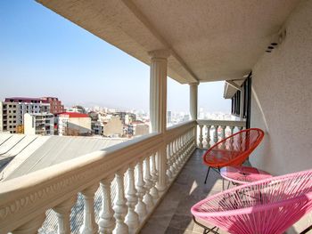 Балкон с видом на город, хорошая кровать, чистая ванная комната.