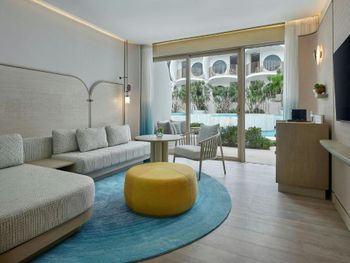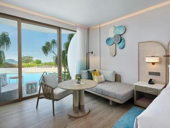 Главная проблема - это двери между смежными номерами. Их забыли звукоизолировать от слова совсем. Просто разговор на обычном тоне из соседнего номера слышно полностью. Смех, вскрикивания, телевизор - тем более. Фен из соседнего номера как будто у тебя над ухом. Отель в отдалении от цивилизации. И там супер тихо и комфортно. Если у тебя нет соседей. Две смежных комнат нужно срочно исправить как-то. Плюс учитывать, что море чисто для красоты. Пляж есть, но купаться всё-равно в бассейне, потому что море мелкое, с кучей камней и водорослей в этом месте.
