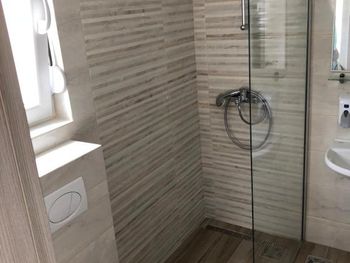 шторка у душа была короткая, а пол то ли недостаточно под наклоном, то ли что, в общем весь пол после душа у нас был мокрый даже если аккуратно мыться и не с сильным напором :(