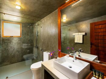 Из минусов 1)Во всех номерах кондиционер направлен на кровать.Без кондиционера спать невозможно из за жары ,а с кондиционером есть риск простудиться. 2) Матрас большой 2х2, высокий ,но не очень качественный так как имеет зависимый блок пружин , из-за которого появляется дискомфорт при движении одного из людей ,хотя отель позиционирует себя как Лакшери 3) На территории идёт стройка ,которая мешает отдыхать из-за шума стройинструментов, возле бассейна всегда носят стройматериалы. 4) Общее впечатления испортило выселение 12.00- по закону -правильно, по британски -правильно, по человечески -не правильно (попросили продлить на 3 часа, были свободные номера) В итоге переодевались и упаковывали вещи в мокром туалете.