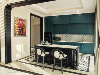 Новый отель; большой шикарный номер с гостиной, спальней, ванной комнатой и гостевым туалетом и с видом на бассейн и на море; на территории отеля аквапарк, недалеко парк аттракционов и сафари парк.
