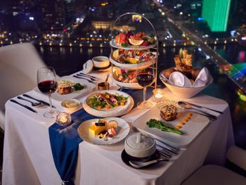 Ресторан с панорамным видом, шоколадный фонтан с фруктами.