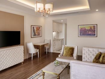 Нет стола для работы в номере, на первом этаже есть какие то помещения, но они скорее подходят для переговоров, один большой круглый стол без розеток. До стен далеко и там розетки сломаны. Вообще отделка в отеле из дорогих материалов, все чисто, но часто эта отделка сделана не аккуратно или не продумано.