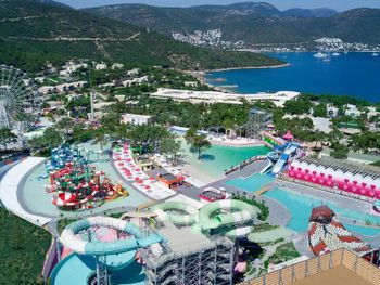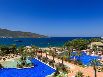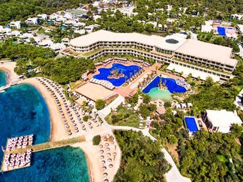 Курортный отель Vogue Hotel Supreme Bodrum Villa расположен на набережной залива Торба и окружен сосновым бором. В распоряжении гостей луна-парк с 17-ти метровым колесом обозрения, картингом и самый большой аквапарк в Бодруме. Отель отлично подойдет для семейного отдыха, так как в отеле действует лучшая детская концепция на Эгейском побережье.