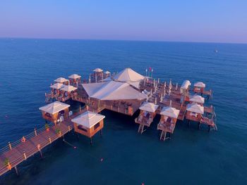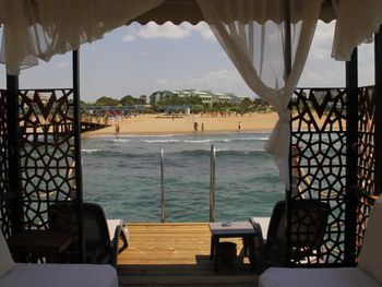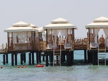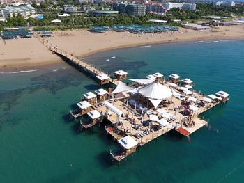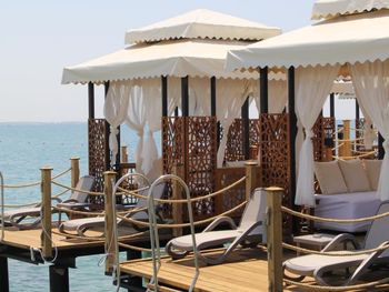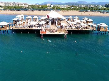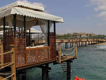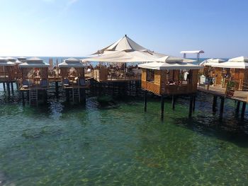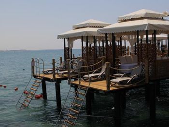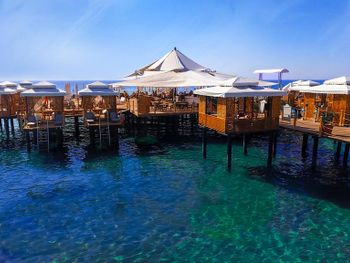 Есть павильоны в аренду на пляже на газоне и на пирсе, в них очень комфортно, постоянно ходят официанты, есть холодильник-в нем фрукты и напитки. Цена 80Евро с 10 до 18. Когда мы были, действовала система 2 (или 3) дня снимаешь, следующий день бесплатно.
