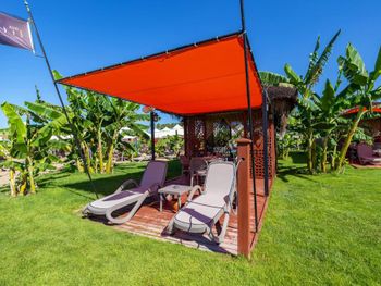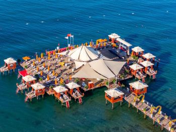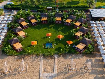 Есть павильоны в аренду на пляже на газоне и на пирсе, в них очень комфортно, постоянно ходят официанты, есть холодильник-в нем фрукты и напитки. Цена 80Евро с 10 до 18. Когда мы были, действовала система 2 (или 3) дня снимаешь, следующий день бесплатно.
